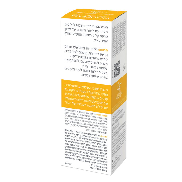 הוראות שימוש: יש למרוח באחידות ובנדיבות מדי יום על הפנים והצוואר לפני חשיפה לשמש (כמות קטנה של מוצר מפחיתה את רמת ההגנה מהשמש). יש להרחיק מאור. יש לנער לפני השימוש. יש למרוח שוב לאחר הזעה, שחייה או ייבוש במגבת כדי לשמור על ההגנה. יש להרחיק מאור. יש לנער לפני השימוש. יש להימנע ממגע עם בדים. למבוגרים. יש למרוח על עור בריא. חשיפת יתר לשמש עלולה לגרום נזק בריאותי גם כאשר מורחים קרם הגנה.