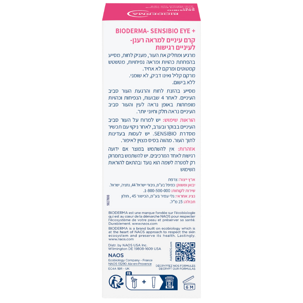 קרם-ג'ל עיניים סנסביו של ביודרמה – קרם עיניים לעור רגיש. מרגיע תחושת אי נוחות באזור העיניים. מועשר בקומפלקס חדשני. מכיל קפאין, ללא בישום, בסיס טוב לאיפור.